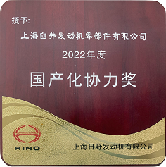 上海日野發(fā)動(dòng)機(jī)有限公司授予 上海臼井公司“2022年度 國(guó)產(chǎn)化協(xié)力”獎(jiǎng)。